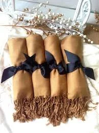 Cada pashmina será planchada y cuidadosamente envuelta en rollos de lazo de satén y tarjeta de agradecimiento de invitado.
