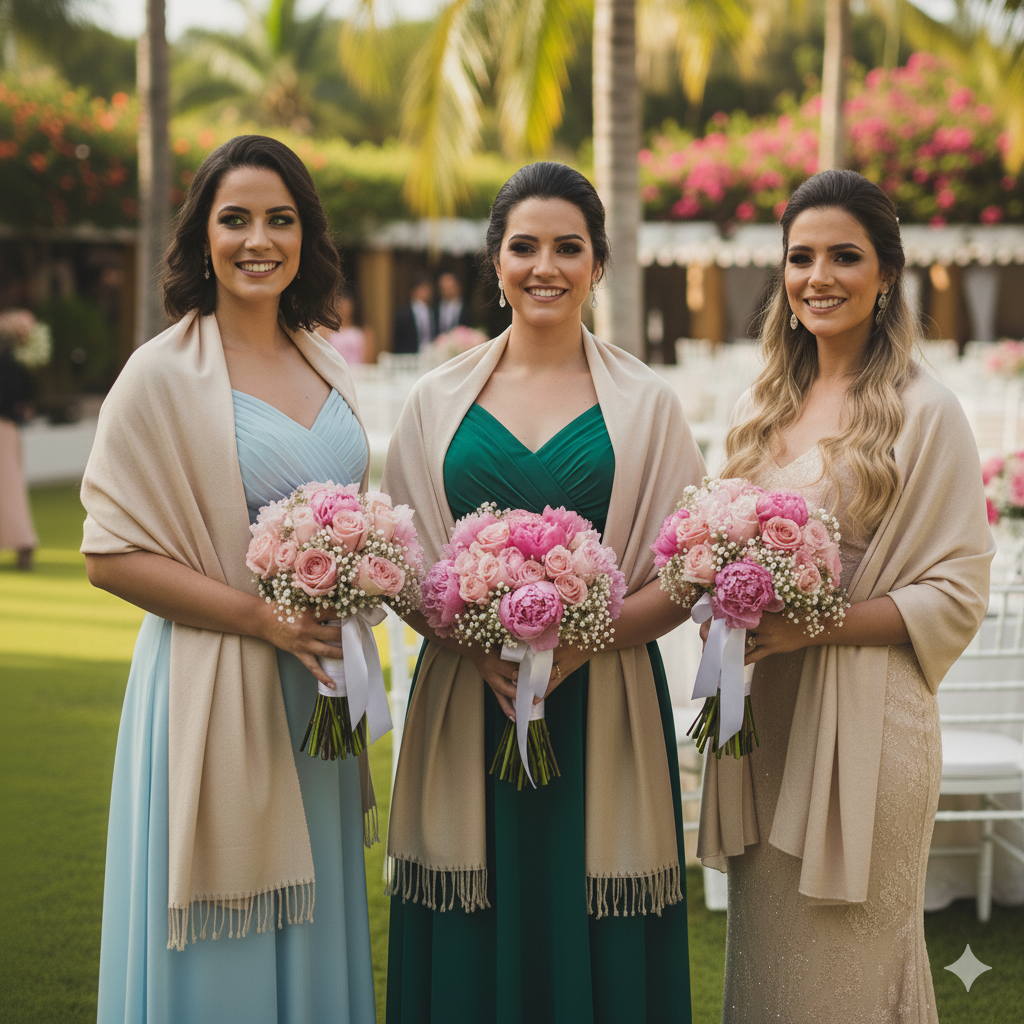 Nossas pashminas são escolhidas para serem usadas no momento certo, sem quebrar a estética do casamento.